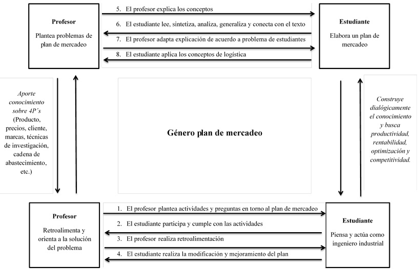 Al enfrentarse al planteamiento y la solución de problemas, los estudiantes aplicaban prácticas disciplinares en las que debían actuar y pensar como un ingeniero industrial. La lectura y la escritura les planteaban una metodología para lograrlo. La solución de problemas se ubicaba en un marco de interacción que integraba: la explicación de la profesora, los conocimientos previos, las preguntas y los casos que les planteaba la docente o las relaciones que se establecían con los problemas del plan de mercadeo, el análisis del problema por parte de los participantes, la conexión con lo leído, el conjunto de recomendaciones de la profesora, la retroalimentación de ella como experta, la modificación o la afirmación del pensamiento y la actuación del estudiante en la resolución de problemas. Todo en un proceso dialógico. En la Figura 2 se presenta un esquema que resume este marco de interacción en torno al género plan de mercadeo.