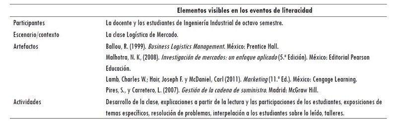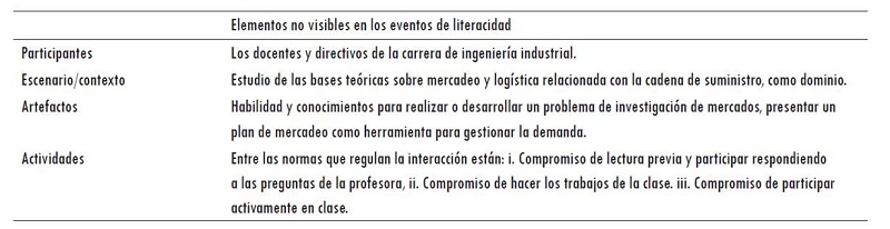 En las clases se observó que se buscaba la interpretación de textos a través de la generación de un espacio dialógico, además de un trabajo progresivo de producción del plan de mercadeo. Como se explicó anteriormente se trata de una clase teórico-práctica. Para cada sesión se asignaban las lecturas a los estudiantes, quienes debían explicar los temas del curso a través de videos que incluían la explicación de conceptos y ejemplos. Cada una de estas explicaciones era aprovechada para que los estudiantes adquirieran criterios para tomar decisiones sobre recopilar, tabular y analizar datos cuantitativos y cualitativos, todo lo cual les serviría para diseñar el plan identificando las oportunidades de marketing. Esto constituye una serie de elementos visibles y no visibles en los eventos letrados, como se presentan en las Tablas 2 y 3.