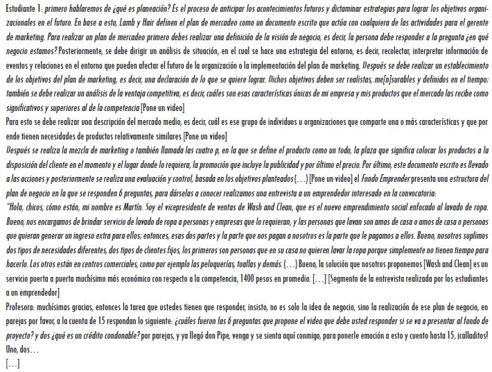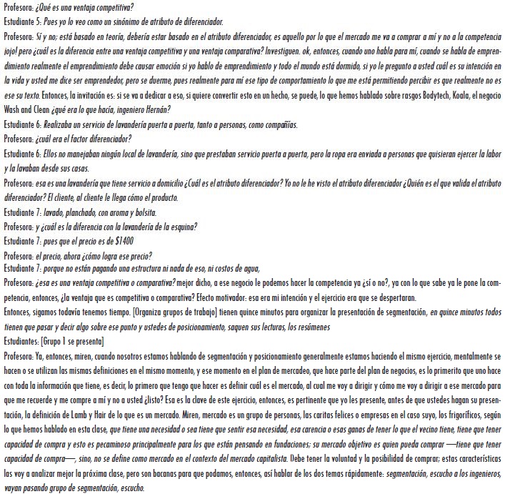 Entre las principales estrategias de enseñanza e inclusión de las prácticas letradas están: la solución de problemas, la articulación de los temas tratados en la clase, las exposiciones y los talleres con el desarrollo del plan de mercadeo y la importancia que le atribuye a la oralidad. En la Tabla 4, se presenta la transcripción de un segmento de la clase.