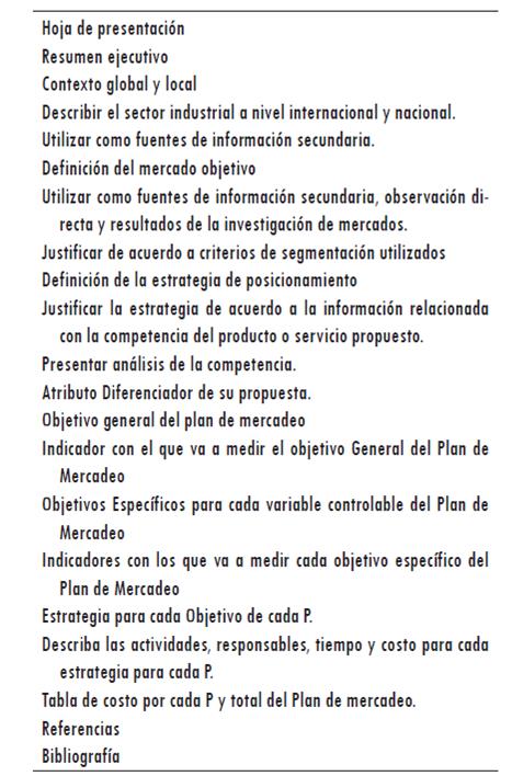 Como se ha argumentado, la identidad disciplinar hace referencia a las prácticas y a los discursos que llevan a los estudiantes a ser, hacer y pensar como ingenieros. El conocimiento de la clase de lm se produce, entre otros, mediante la escritura del plan de mercadeo, el cual era documentado teórica y metodológicamente, y retroalimentado a lo largo del semestre. La construcción del plan era enriquecida por entrevistas, análisis de datos recopilados por los estudiantes, que luego eran descritos a través de explicaciones, pruebas, hipótesis, diagramas, gráficos, en definitiva, códigos establecidos por los ingenieros. La escritura de este género constituyó un trabajo que ponía a los estudiantes a pensar como ingenieros. De acuerdo con Lamb et al. (2011), un plan de mercadeo es: “el proceso de crear y mantener un buen acoplamiento entre los objetivos y recursos de una compañía y las oportunidades en evolución del mercado. La meta de la planeación estratégica es alcanzar la rentabilidad y crecimiento a largo plazo” (p. 24). En el programa del curso se define la estructura del plan de mercadeo, como aparece en la Tabla 5.