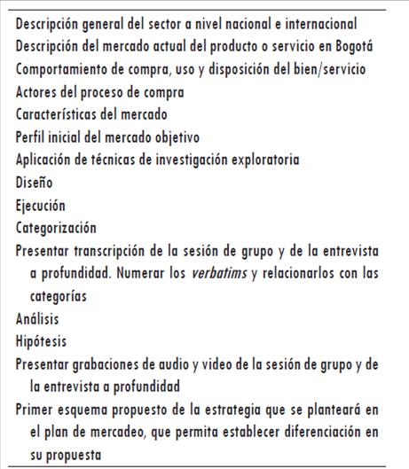 Para llegar a esta versión que da alcance a los puntos de la Tabla 5, los grupos debían haber identificado el mercado objetivo, los consumidores, hacer entrevistas y encuestas y categorizarlas a través de verbatims, citando segmentos concretos de la entrevista y atribuyéndoles un código. A partir de este trabajo de campo inicial exploratorio, los estudiantes preparaban la primera parte de su plan de mercadeo, que consta de lo siguiente, como se explica en la Tabla 6.