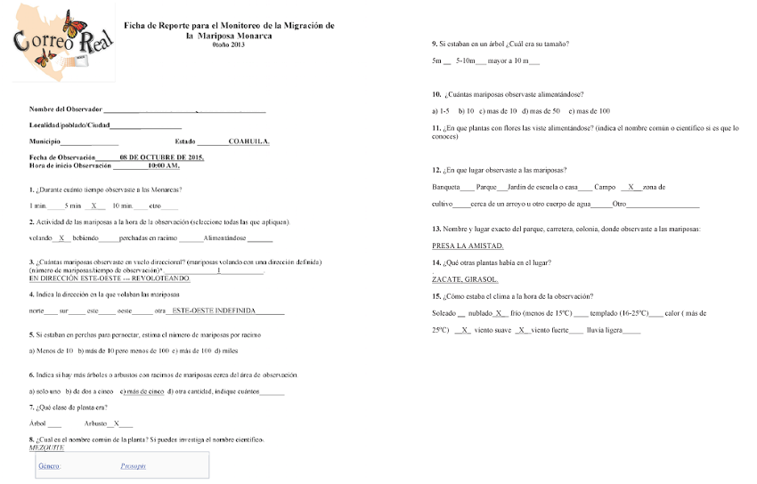 Además de los datos del autor que deben de completarse en las primeras líneas, algunos incisos como [Fecha de observación], [Hora de observación], así como las preguntas número 8 [¿Cuál es el nombre común de la planta? Si puedes, investiga el nombre científico], 11 [¿En qué plantas con flores las viste alimentándose? (indica el nombre común o científico, si es que lo conoces)], 13 [Nombre y lugar exacto del parque, carretera, colonia, donde observaste a las mariposas] y 14 [¿Qué otras plantas había en el lugar?] deben completarse escribiendo las respuestas. El resto son campos de opción múltiple que el participante debe completar señalando la opción más adecuada, nada lejos de los cuestionarios escolares.
