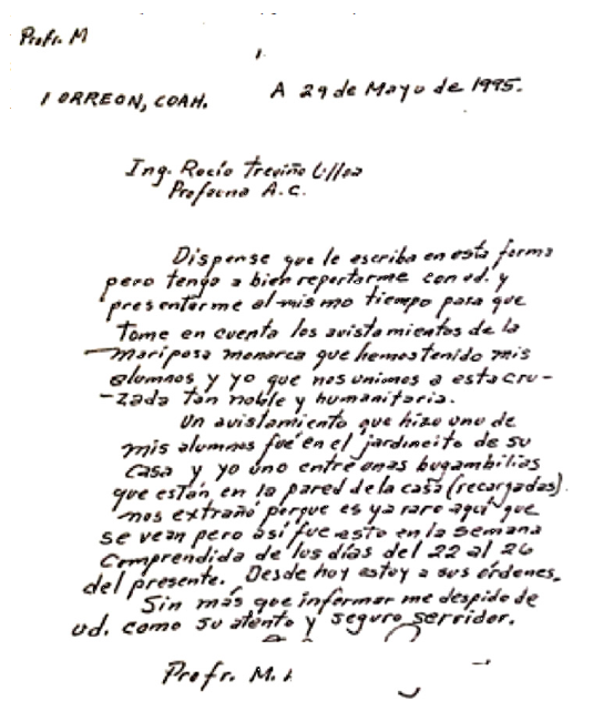 A través del lenguaje escrito, él intentó persuadir a Rocío de la importancia de los datos que reporta [...tome en cuenta los avistamientos de la mariposa que hemos tenido mis alumnos y yo que nos unimos a esta cruzada tan noble y humanitaria]. Este rasgo en su texto de reporte es una evidencia sólida que muestra que la actividad de monitoreo está construida alrededor de relaciones sociales entre los participantes; Miguel posicionó sus observaciones y las de sus estudiantes argumentando su participación en el programa. Es también evidencia de cómo algunas observaciones no podían ser consideradas por Rocío debido a los retrasos habituales en el correo postal o el envío de paquetería.