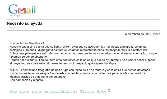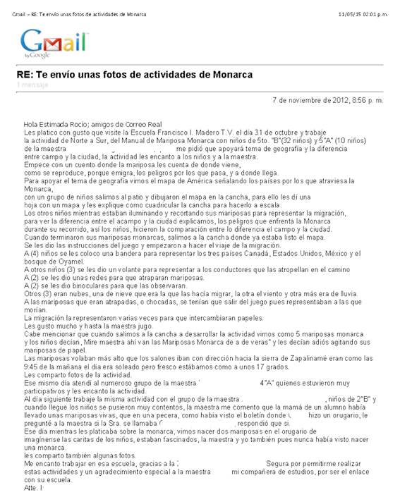En su escuela, una institución privada, la autora se involucró en este programa. Tomó las capacitaciones y promovió varios proyectos, entre ellos el establecimiento de áreas verdes y jardines que aparecen señalados en el texto de reporte como “hospederos” por su función como refugio de varias especies de mariposas y aves, entre otros. El texto, enviado desde una cuenta de correo electrónico personal, es corto, directo y sin los formalismos que hemos encontrado en otros documentos, como las cartas o los textos personales mostrados previamente.