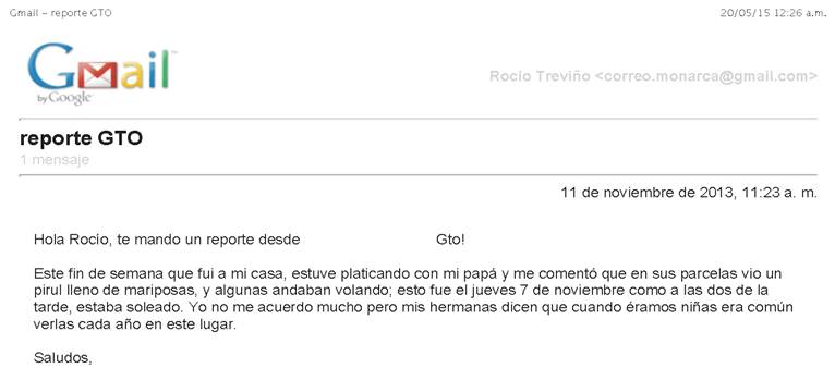Al igual que el ejemplo previo, este texto de reporte (Figura 6) fue enviado por medio del correo electrónico, por Alejandra, una funcionaria pública que participó en un equipo de técnicos encargados de la administración de varias áreas naturales protegidas. Está fechado en el mes de noviembre de 2013, y a pesar que desde el título del correo [reporte en Gto] y la primera línea se señala el tipo de información que el mensaje contiene, así como la intencionalidad del documento [te mando un reporte desde Gto], mucha de la información ahí contenida nos dice más sobre las condiciones de producción de los datos que sobre la migración de la mariposa monarca.