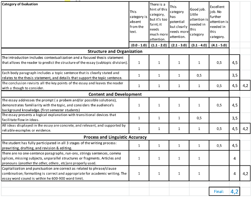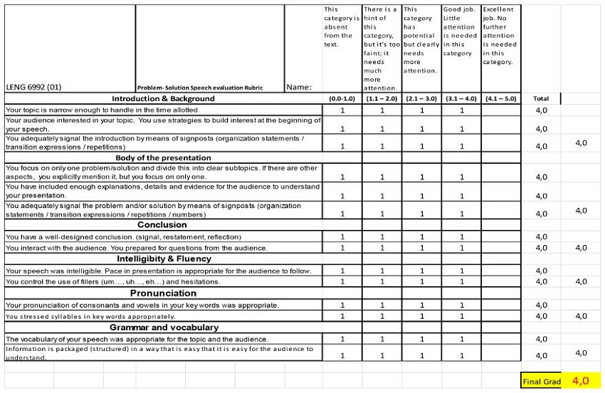 I am an instructor of the second course of an EAP program for different PhD programs at a private university in Colombia. In this course, my students learn to write academic essays and present them in the form of short oral presentations (OPs) whose content is their research in progress. I expect essays to be clear, organized, and linguistically accurate (see appendix A for criteria) and oral presentations (see appendix B) to additionally be engaging and easy to understand, given that the audience is composed of other PhD classmates from different disciplines. Essays usually meet the expected criteria, arguably because of the opportunity students have to revise and edit them with the help of the instructor. In the oral delivery, however, struggling students face several difficulties ranging from lack or misuse of linguistic resources to discontinuous, choppy, or halting talk; lack of engagement with the audience; and heavy dependence on slides or scripted versions of their talk, which in many cases recycle the sentences in the essays (Nausa, 2015).
