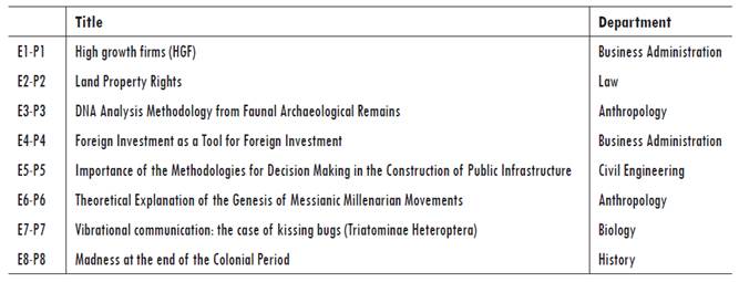 This research was carried out in a Colombian EAP program aimed at helping students enrolled in PhD programs in a private university in Bogotá improve their academic writing and public speaking skills (Janssen, Ángel, & Nausa, 2011). In the second course of this program, students learn to write essays and present them to their audience of multi-departmental classmates in the form of a short OP. The eight participants in this study were chosen from the nine courses taught since the first semester of 2011. Three students were enrolled in humanities PhD programs (anthropology and history), three in social science programs (law and business), and two in science/engineering programs (engineering and biology). Rough estimations allow us to state that students in this course would be placed between the A2 and B1 levels of the Common European Framework of Reference for Languages (CEFR).