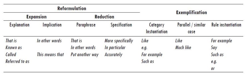 In reformulation a new unit is introduced as a restatement of the old unit to frame it from a different stance, elaborate on it, or add emphasis to it. Reformulations are classified into two types: expansions and reductions Hyland (2007).