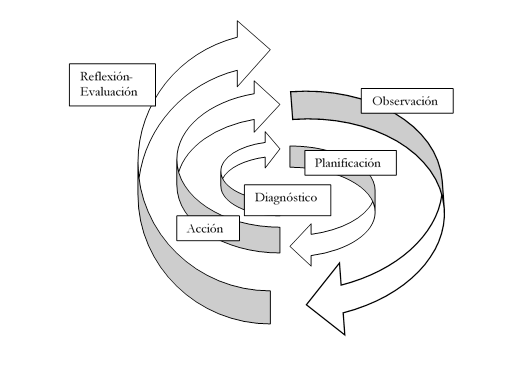Estas condiciones fueron sistematizadas en un modelo genérico de espiral de ciclos sucesivos, entre los que se encuentran: “Diagnóstico”, “Planificación”, “Acción”, “Observación” y “Reflexión-Evaluación” (Elliott, 1993; Kemmis y McTaggart, 1988; Lewin, 1973). La Figura 1 expone los ciclos contemplados en el presente estudio.