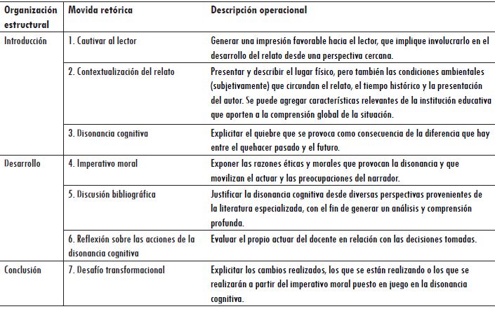 Para alcanzar el objetivo específico 2, describir la organización retórica del género de reflexión pedagógica, mediante la identificación de los segmentos textuales que lo configuran, se llevaron a cabo las siguientes acciones: en primer lugar, se establecieron determinados segmentos textuales (movidas), con el fin de orientar la escritura de los docentes. En segundo lugar, se analizaron los textos producidos, para ver la pertinencia de las movidas y evaluar el grado de complejidad para alcanzar la organización retórica propuesta y la incorporación de nuevos conocimientos lingüísticos para comunicar de forma más eficiente esta reflexión pedagógica. Finalmente, se ajustó la nueva propuesta y se evaluó por juicio de expertos. Esta triangulación de los datos permitió consolidar la estructura que se presenta en la Tabla 1.