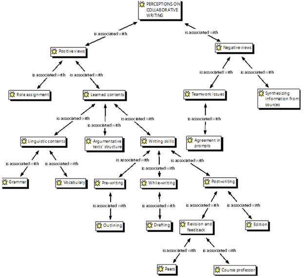 A semi-structured interview was also used to gauge participants’ perceptions regarding collaborative writing in English as an L2. Participants’ answers were recorded during the interview and then transcribed. Content analysis was utilized to process the qualitative data collected in the semi-structured interviews. For this, the transcribed responses were coded and categorized by means of Atlas.ti. Then, findings were plotted in a conceptual network (see Figure 1) generated by the software, showing all the semantic connections based on the participants’ oral discourse. This information was clustered into subcategories of positive views and negative views.