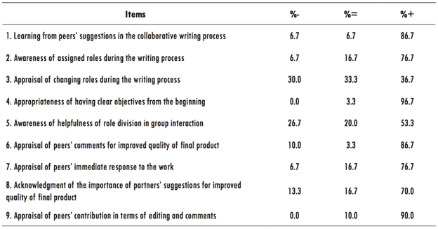 Overall, quantitative results show that the pre-service EFL teachers held generally positive perceptions of how they approached the collaborative writing process. It seems they value cooperating with their peers and taking suggestions from them in order to learn. High proportions of the participants also demonstrated that they value setting goals from the beginning of the writing process, and that they value peer contribution in terms of editing and comments.