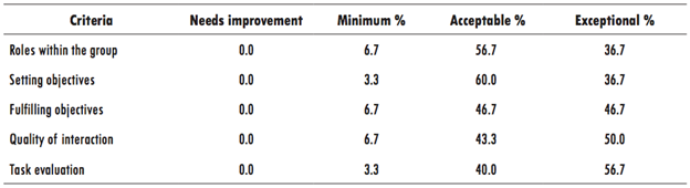 To obtain the pre-service EFL teachers’ self-assessment regarding their collaborative writing process in English as an L2, participants were asked to complete a rubric created by the researchers that allowed them to measure the degree to which they accomplished the collaborative writing tasks. According to Barberá and De Martín (2009), a rubric consists of specific assessment areas and their achievement levels. The dimensions considered in this instrument were: roles within the group, setting objectives, fulfilling objectives, quality of interaction, and task evaluation.