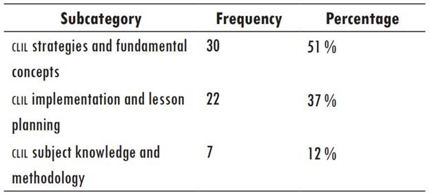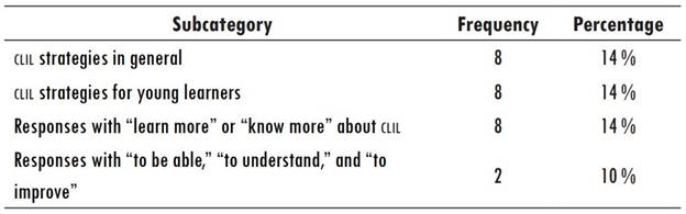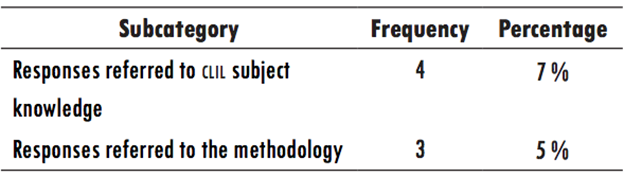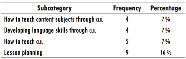 The third set of responses, 12% out of the 59, were categorized as CLIL subject knowledge and methodology, as shown in Table 6. Few responses (7%), showed teachers’ interest in learning more about subject content, while even less (5%) mentioned teachers’ interest in methodology.