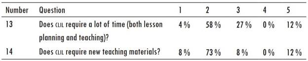 The results of the study revealed that all the teachers that participated in the study mainly thought of the approach to improve language and did not see CLIL as an approach to education. However, it is interesting to observe that the study found that 34 % of the participants were conscious of their training needs and aware that they required more content knowledge to improve their teaching practice. These needs had to do with time for lesson planning and availability of teaching resources which are further developed below.