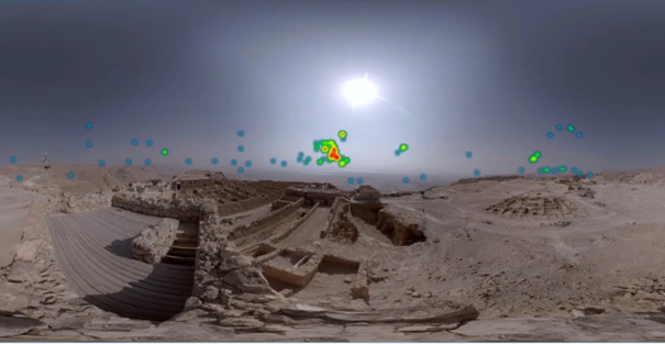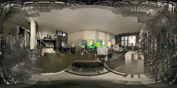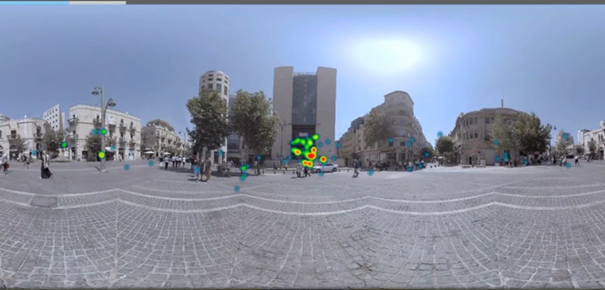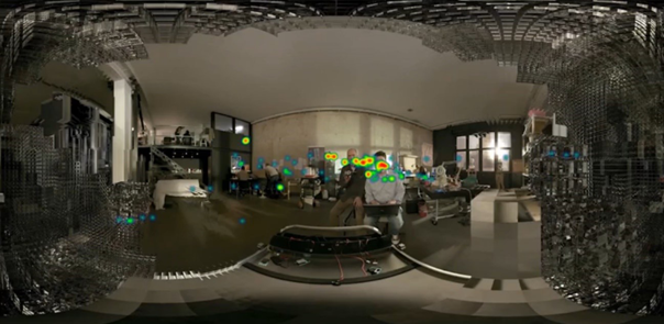 […] the CVR-Analyzer, which can be used for inspecting head pose and eye tracking data of viewers experiencing CVR movies. The visualized data are displayed on a flattened projection of the movie as flexibly controlled augmenting annotations, such as tracks or heatmaps, synchronously with the time code of the movie and allow inspecting and comparing the users’ viewing behavior in different use cases. (Rothe et al., 2018, p. 127)