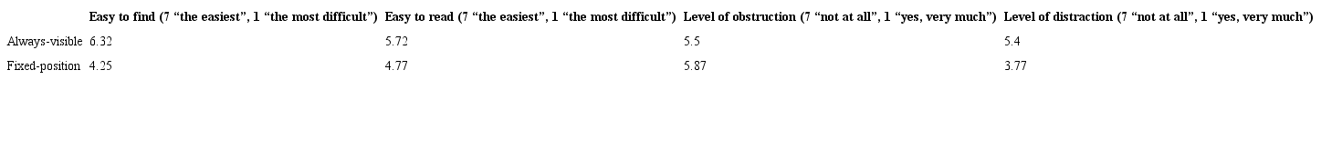 When asked whether always-visible subtitles were obstructing important parts of the image based on a 7-point Likert scale (7 being “not at all”, 1 being “yes, very much”), participants felt that fixed-position subtitles (M = 5.87; sd = 1.28) were slightly less obstructive than the always-visible subtitles (M = 5.5; sd = 1.9). However, the difference is not statistically significant (Z = -1,123, p= .261, ties = 23). Two correlations were found. Firstly, participants with hearing loss (M = 6.2) considered always-visible subtitles to be less obstructive than hearing participants (M = 4.8) (r= -.452, p = .003). Secondly, participants with hearing loss (M = 6.5) also considered fixed-position subtitles less obstructive than the hearing participants (M = 5.25) (r= -.552, p = .000). A difference was found when participants were asked if the subtitles were distracting them from what was happening in the video based on a 7-point Likert scale (7 being “not at all”, 1 being “yes, very much”). The always-visible subtitles (M = 5.4; sd = 1.98) were considered to be less distracting than the fixed-position subtitles (M = 3.77; sd = 2.33). This difference is statistically significant (Z = -2,696, p= .007, ties = 13). Another correlation was found here: Participants with hearing loss (M = 4.8) considered the fixed-position subtitles to be less distracting than the hearing participants (M = 2.75) (r= -.397, p = .011). In Table 1, a summary of the results for preference regarding always-visible and fixed-position subtitles can be found.