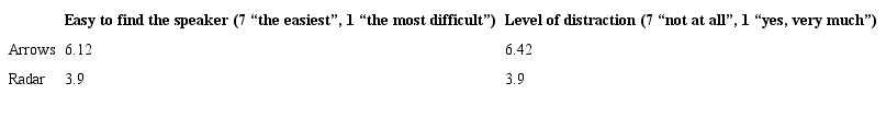 A difference in the results was found when asking about how easy it was to find the speaker using the arrow guiding method based on a 7-point Likert scale (7 being “the easiest”, 1 being “the most difficult”; see Table 2). Participants felt that the speaker was easier to find with the arrows (M = 6.12; sd = 1.26) than with the radar (M = 3.9; sd = 2.24). The difference is statistically significant (Z = -4.166, p = .000, ties = 10). A difference was also found regarding the level of distraction with each method based on a 7-point Likert scale (7 being “not at all”, 1 being “yes, very much”). Arrows (M = 6.42; sd = 1.03) were considered to be less distracting than radar (M = 3.9; sd = 2.46). The difference is statistically significant (Z = 4.125, p = .000, ties = 12). A correlation was found here: The four participants that played video games on a daily basis found the radar less distracting (M = 1) than the rest of the participants (M = 4.22) (r= -.460, p = .003).