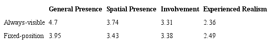 In this section, results from the IPQ questionnaires for each video are analyzed and compared. Statistical comparisons were calculated using a Wilcoxon signed-rank test.