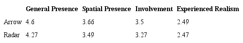 A comparison between arrow and radar methods was made in the IPQ and the results are as follows (see Table 4): general presence item (Z = -1.852, p = .064, ties = 21), spatial scale (Z = -1.000, p = .317, ties = 13), realness scale (Z = -1.430, p = .153, ties = 7). The test indicated that the differences between the results were not statistically significant. However, for the involvement scale, the test indicated that the difference between the results is statistically significant (Z = -2.138, p = .033, ties = 12). In this case, the radar had a negative impact on the involvement of the participants.