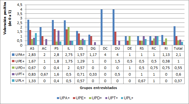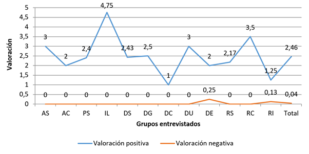 En suma, las valoraciones positivas (VGP+) resultaron muy frecuentes y las negativas testimoniales, de tal suerte que la media total de aparición por individuo es 2,46 veces en positivo (un total de 140 respuestas), frente a 0,04 en negativo (apenas dos respuestas), como se aprecia en la Figura 1.