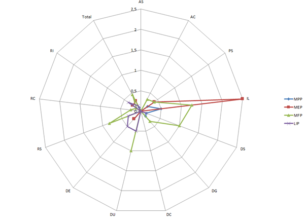 Para la MPP no existen diferencias entre grupos (Umpp= 1,063, p = 0,413), dadas las bajas frecuencias de aparición. Y para la MEP, solo el grupo IL obtiene diferencias (Umfp= 3,103, p = 0,008) en el cálculo estadístico HSD (p < 0,05) respecto del resto.