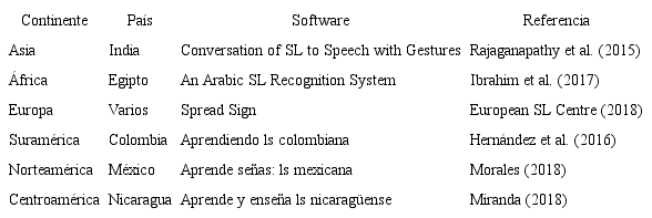 En los últimos tiempos han emergido variadas herramientas tecnológicas más interactivas y modernas para propiciar el aprendizaje de la LS y para coadyuvar su enseñanza, y no necesariamente en formato físico, sino online, lo que ha extendido su visualización y sus posibilidades de empleo. Entre las más actuales y cercanas a la que se presenta están las de Garza y Monsivais (2015) y Miranda (2018) para México; Hernández et al. (2016) para la LS colombiana; Miranda (2018), para la LS nicaragüense, y la de la Universidad Nacional de Costa Rica (2018), para su LS nacional. Una revisión de otras anteriores y de otros contextos puede hallarse en Hernández et al. (2015) y Alaín (2019).