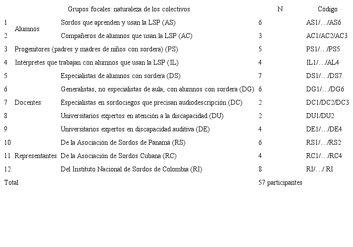 Siguiendo las indicaciones de Sampieri et al. (2010), el tamaño de los grupos debe oscilar entre tres y diez personas, y así se hizo (salvo en dos colectivos, por imponderables de última hora de las agendas de los participantes), para garantizar un debate suficientemente enriquecido y que a la vez resultara operativo para la participación de todos, más un moderador (e incluso dos, en ocasiones), que realizó las preguntas y orientó la discusión, tras crear el ambiente adecuado, es decir, relajado e informal, que invitara a la participación libre y cómoda de cada miembro. Cuando fue necesario, se incorporó un intérprete de LSP, para posibilitar una comunicación fluida.
