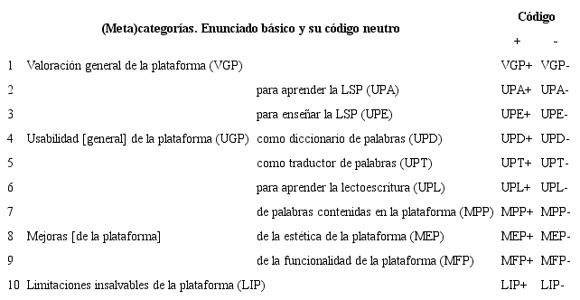 En suma, se determinaron cuatro metacategorías: 1) valoración general de la plataforma, 2) usabilidad [general] de la plataforma, 3) mejoras [de la plataforma], y 4) limitaciones insalvables de la plataforma. Dentro de ellas, tuvieron cabida las categorías concretas, con sus códigos correspondientes, contempladas en la Tabla 3.