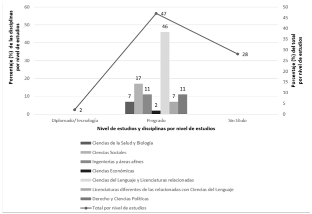 La mayoría de quienes tienen estudios en traducción e interpretación han obtenido títulos de pregrado y especialización. Por su parte, aquellos que ejercen la profesión, pero que provienen de otras áreas, como lenguas modernas, derecho, ciencias políticas, ingeniería, educación, comunicación, literatura y filosofía, por citar las más comunes, han manifestado tener principalmente títulos en pregrado y maestría. Así mismo, más de la mitad de los encuestados indicó que se capacita, por lo menos una vez al año, mediante cursos complementarios, en especial de redacción, edición y corrección de estilo.