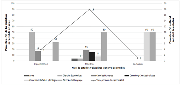 Adicionalmente, respecto a títulos de áreas diferentes a la traducción e interpretación, 47 % de los traductores encuestados expresó poseer título de pregrado, principalmente en las áreas de Ciencias del Lenguaje y licenciaturas relacionadas, Ciencias Sociales, Ingenierías y áreas afines y Derecho y Ciencias Políticas. El 2 % indicó haber cursado un diplomado o tecnología (sobre traducción en ámbitos de negocios y administración de empresas, respectivamente). En contraste, el 28 % manifestó no tener ningún título académico (véase Figura 1). En cuanto a formación posgraduada, 18 % dijo tener título de maestría; el 1 %, de doctorado, y el 4 %, de especialización. Las áreas más comunes en la formación posgraduada son Ciencias del Lenguaje, Ciencias Económicas, Ciencias Humanas, Derecho y Ciencias Políticas y Ciencias de la Salud y Biología. (véase Figura 2).