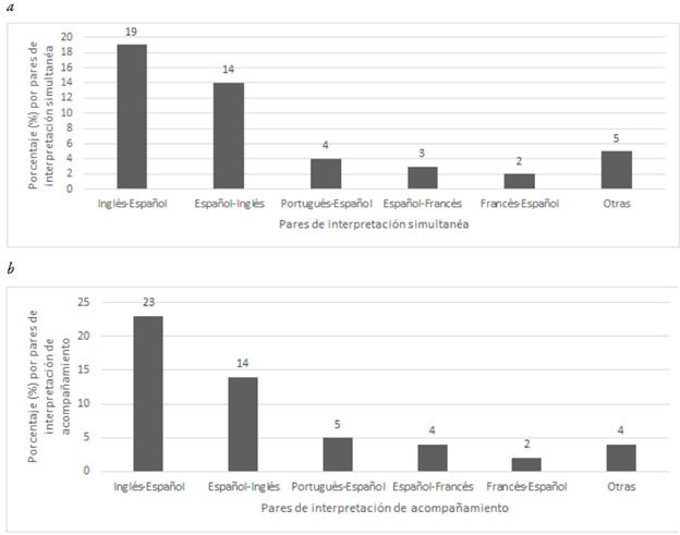 En interpretación de acompañamiento, los pares de lenguas con mayor porcentaje son nuevamente inglés-español (23 %) y español-inglés (14 %), seguidos por el francés (4 %). Los pares de idiomas que involucran el italiano y el alemán solo tuvieron el 1 % (véase Figura 3b).