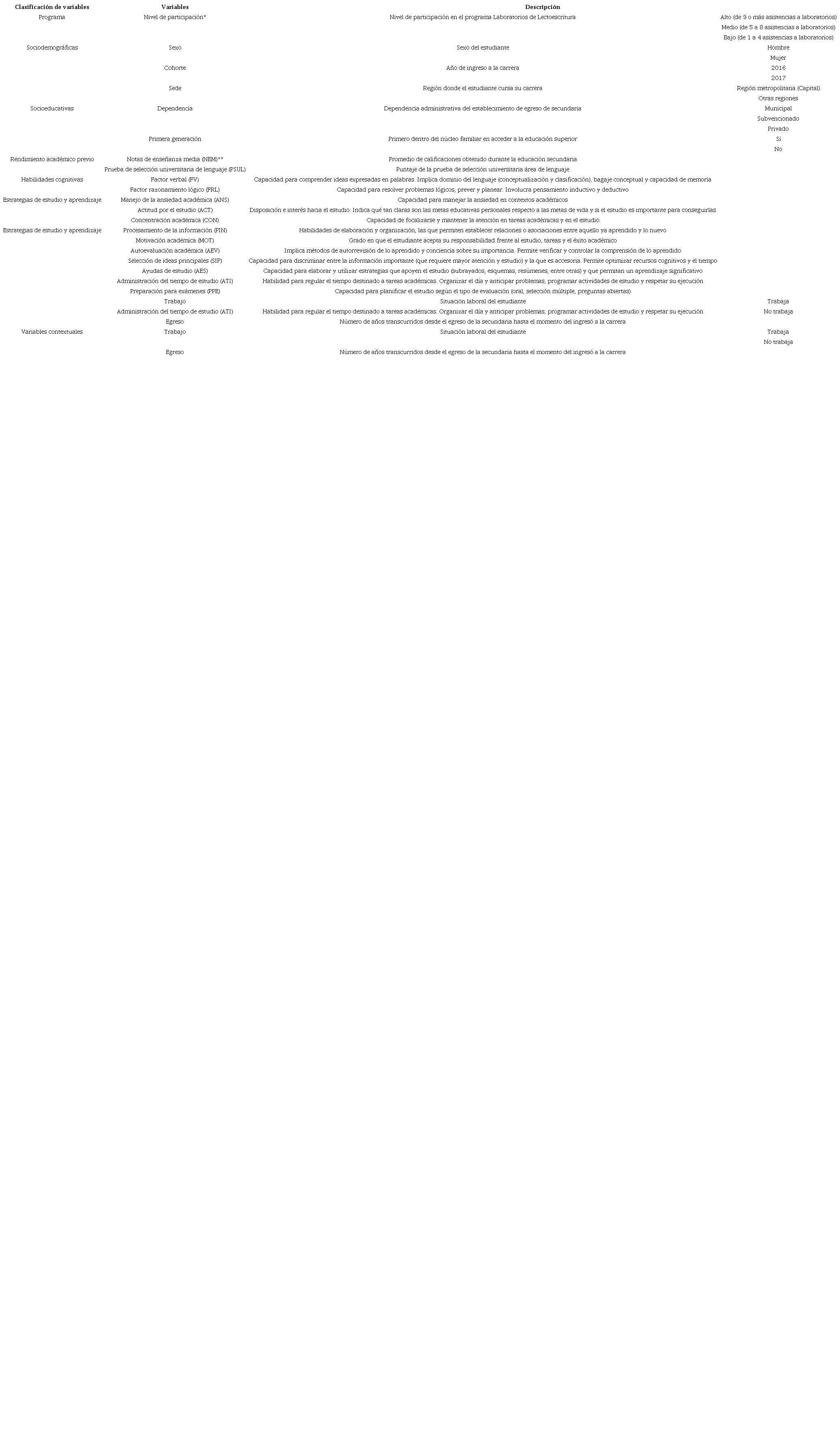 Los análisis fueron realizados con el software estadístico STATA® 13. Entre las variables independientes ingresadas al modelo predictivo (véase Tabla 1) están el rendimiento académico previo, las habilidades cognitivas y las estrategias de estudio y aprendizaje. Con esto se busca mantener constante su efecto, a fin de conocer si el nivel de participación en el programa influye en el rendimiento que los estudiantes muestran en la asignatura analizada.