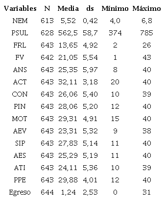 El promedio de egreso de la secundaria también es estadísticamente significativo en la predicción del rendimiento de la asignatura. Por cada punto de nem, el promedio de Evolución Histórica de la Psicología aumenta en 0,22 puntos (t = 4,01; p < 0,01). Lo mismo ocurre con el puntaje psul (t = 5,59; p < 0,01) que, al crecer en un punto, mejora en 0,026 puntos el rendimiento de los estudiantes en la asignatura estudiada. Así, el pasar de los 500 a 600 puntos en la psul incrementa en promedio 2,6 puntos la calificación final de la asignatura en la que se sitúa el programa.