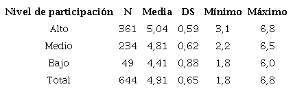 En la Tabla 3 se aprecia que a medida que aumenta el nivel de participación, también se incrementa el promedio del curso Evolución Histórica de la Psicología, alcanzando una diferencia de 0,63 puntos entre el nivel “alto” de participación y el “bajo”. De igual modo, en la Figura 2 se muestra que la pendiente que fija la mediana tiende a inclinarse a medida que disminuye la participación. Así, el 50 % de los estudiantes que tiene un “alto” nivel de participación en el programa obtienen promedios sobre la calificación 5,0, mientras que de los estudiantes que tienen un “bajo” nivel de participación, solo el 25 % logra superar esta calificación promedio (5,0).