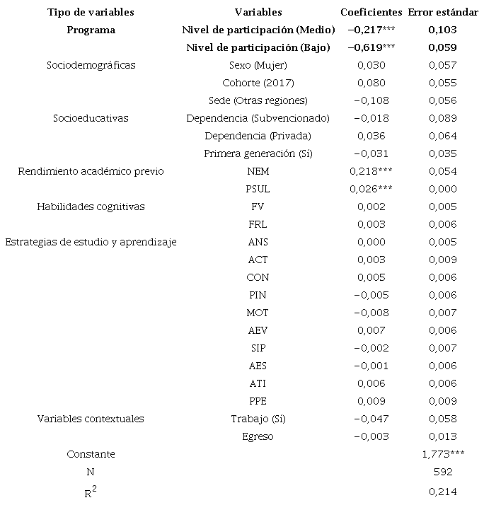 En la Tabla 4 se resumen los coeficientes asociados a cada variable. En ella se observa que, de acuerdo con el R2 (porcentaje de variación en la variable dependiente), a nivel general, el modelo logra explicar más del 21 % de la varianza de la variable dependiente. Además, los coeficientes de las variables “Nivel de participación”, NEM y PSUL, resultaron ser significativos (p < 0,01), con un 99 % de confianza.
