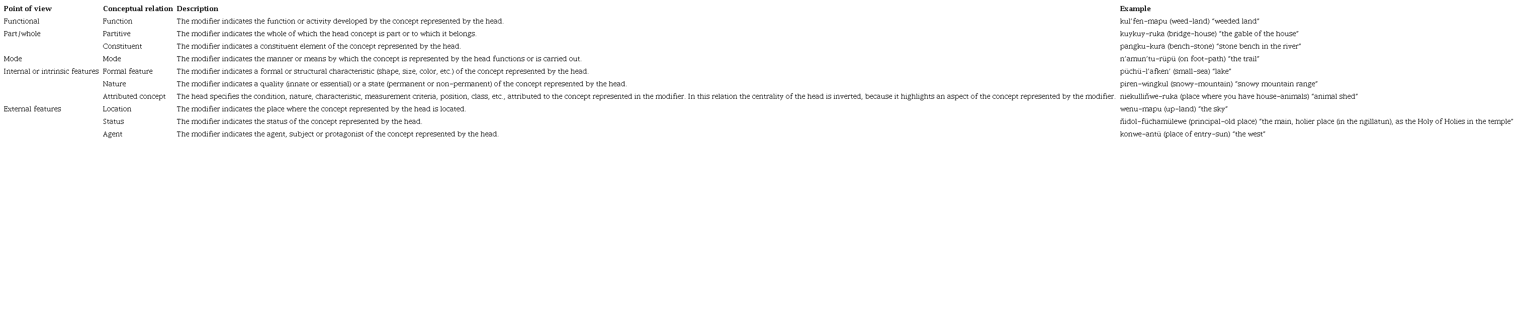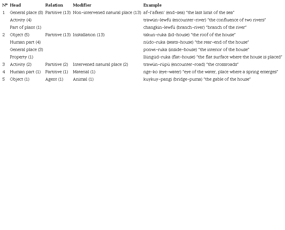 In sum, the analysis of conceptual patterns underlying compound nouns for designating parts of places in Mapudungun shows there is a tendency to mark partitive relations between constituent elements and to represent in the head element of the compound the classes of places they belong to.