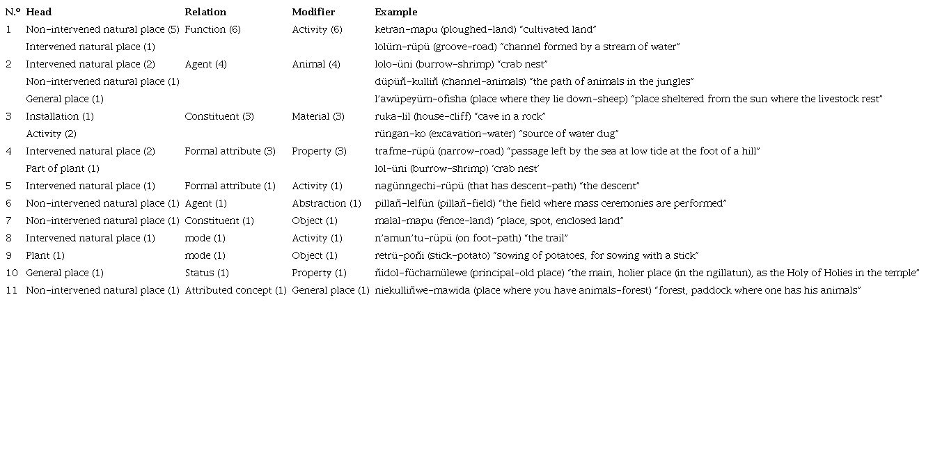 Among natural places, seven conceptual patterns of non-intervened natural places were identified (see Table 4), of which three make up the majority of the cases (26 out of 36). In the first pattern, the modifier indicates a constituent element (another non-intervened natural place, a material, or a plant) of the non-intervened natural place, represented by the head, such as in rapa-ngilawe (clay-ford) “ford of clay.” In the second pattern, the modifier also indicates a constituent element (a plant, a material, or an animal) of the material represented by the head, as in chakay-ko (chakay-water) “chakay bush spring.” An important difference between the two patterns is that, in the second one, the conceptual category of the head is not a place but a material (in 8 cases, ko “water” and, in 1 case, tue “land”) that acquires a locative value by virtue of the relation established with the modifier (as in Pattern 7). In these cases, materials are metonymically re-categorized as places. In the third pattern, the modifier indicates a property of the non-intervened natural place represented by the head, such as in lür-mapu (flat-land) “the plain.” In Patterns 4 to 7, the places or materials (categorized as places) in the head are specified by properties, places, materials, or activities represented by the modifier through different types of relationships.