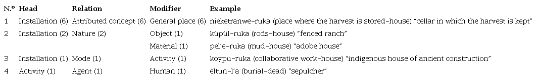 Non-natural places are subdivided into installations and territorial divisions. For installations, four conceptual patterns have been identified (see Table 6). The first pattern, which comprises the majority of cases (6 out of 10), selects an installation concept in the head which emphasizes the man-made nature of the general place concept represented in the modifier, such as nieketranwe-ruka (place where the harvest is stored-house) “cellar in which the harvest is kept.” The modifier is a derived stem that expresses the notion of place by means of the locative suffix, -we or -peyüm, while the head indicates the man-made characteristic of this place by means of the lexical stem ruka “house.” For example, in niekulliñwe-ruka (place where you have animals-house) “animal shed,” the head, ruka, indicates the man-made character of the modifier, niekulliñwe, as opposed to niekulliñwe-mawida (place where you have animals-forest) “forest, paddock where one has his animals,” where the head, mawida, indicates the natural character of the place, niekulliñwe. In Patterns 2 and 3, the modifier designates the material/object or manner in which the installation represented in the head was constructed, such as in küpül-ruka (rods-house) “fenced ranch” and koypu-ruka (collaborative work-house) “indigenous house of ancient construction,” respectively. In Pattern 4, the modifier represents the protagonist of the activity represented by the head (referring metonymically to an installation concept), as in eltun-l’a (burial-dead) “sepulcher.”