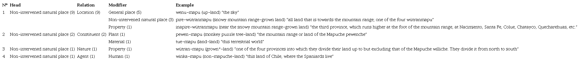 Terms and their constituent elements are classified according to the conceptual class they represent. For instance, the unit ketran-mapu (land-cultivate), “cultivated land,” belongs to the concept class of intervened natural places; the head constituent element mapu represents a non-intervened natural place, and the modifier element ketran represents a human activity concept.