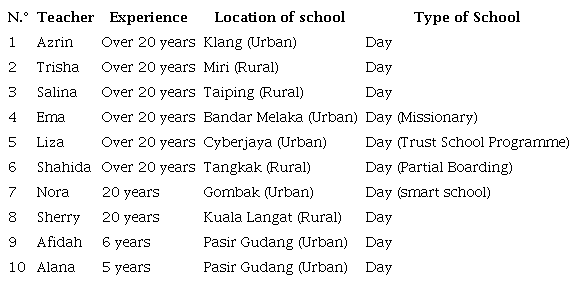 Ten secondary school English teachers from both East and West Malaysia participated in the study on a voluntary basis. All participants were women. With the exception of one teacher who has a degree in Business Admin with a diploma in Education, all teachers have a bachelor’s degree in teaching English as a Second Language (TESL). All of the teachers have English language teaching experience ranging from five to 20 years. They teach a mixture of form levels ranging from Form 2 to Form 6 (ages 14-18) students. The researchers contacted the participants and informed them of the particulars of the study, including the purpose of the study, the activities during the interviews as well as the research in general and how much time was required.