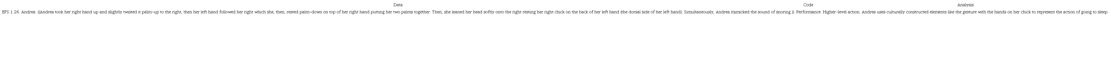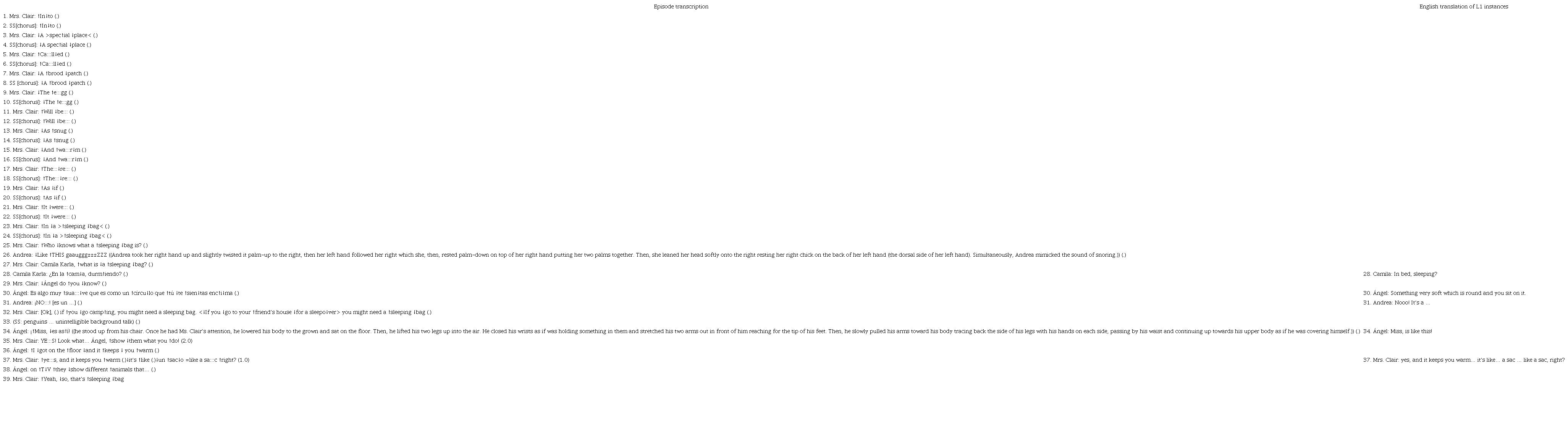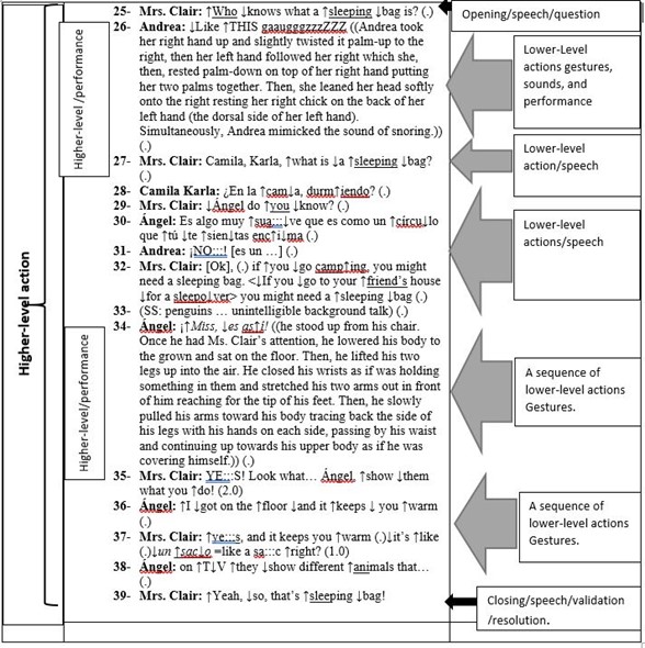 In addition to being composed of a sequence of lower-level actions, this higher-level action (the conversation about the meaning of sleeping bag) also contained other higher-level actions embedded within. For instance, in Turn 26, Andrea provided an explanation which did not only contain a sequence of lower-level actions, but that it also integrated a multiplicity of modes. As a response to Mrs. Clair’s question, Andrea opened her higher-level action (her grappling with Mrs. Clair’s question) with the announcement that her answer was going to be demonstrated by saying “Like this” in Turn 26. Then, she gestured and performed going to sleep and made a sound that resembled snoring as a part of her performance.