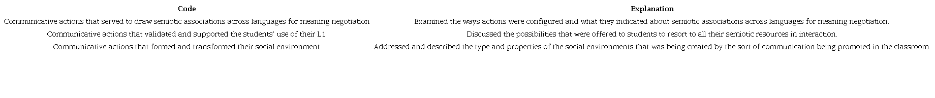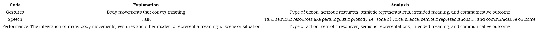 In a subsequent stage, we coded the way the participants used resources and modes in communicative action. Table 3 shows the codes that emerged in this stage, and Table 4 shows a code example