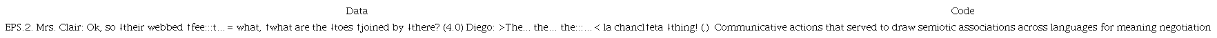 Similarly, in Episode 2, while “the Flip-flops thing” in line two is not exactly the answer Mrs. Clair was looking for, it certainly does reveal a semiotic association that Diego made between the concept of webbed feet and flip-flops, exposing some sort of understanding that the learner possessed about the concept. This semiotic association is charged with Diego’s sociocultural identity (García-Mateus & Palmer, 2017) and was articulated in a phrase that evenly distributed Spanish and English-la chancleta thing.