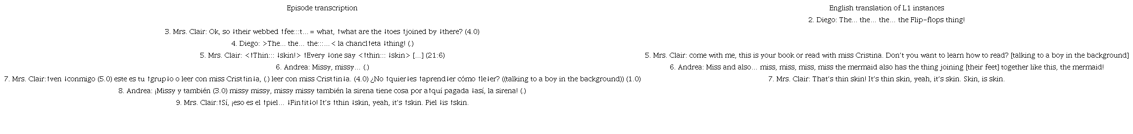 Similar to the way in which Diego was drawing associations and moving fluidly across languages, Andrea also found a common feature shared by the penguins in the text and the mermaids in classic children’s literature tales which allowed her to reveal her understanding of the concept at hand. From Turn 3, Andrea showed eagerness to tell the teacher her discovery: that mermaids had something similar joining their legs! Her contribution is entirely in Spanish, but it perfectly fits the topic and directionality of the conversation being held. Mrs. Clair, in turn, made use of this opportunity to reinforce the expression thin skin, particularly teaching Andrea the word skin in turn four providing the equivalent versions of the expression in Spanish and, subsequently, in English to draw a clear connection between the two.