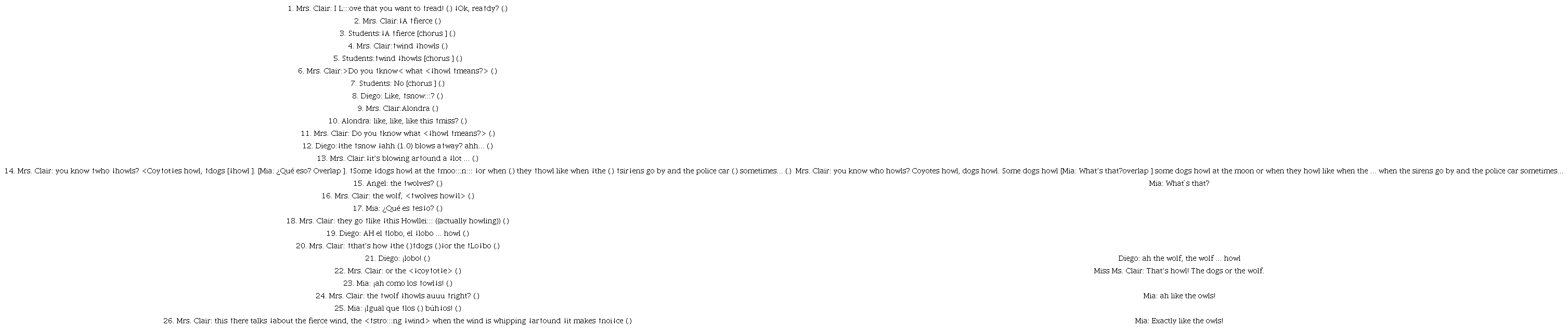 In Turn 11, Mrs. Clair checked for understanding of the word howl. Mia confirmed that the concept was not altogether clear when she asked for clarification in Turns 14 and 17. Then, the teacher gave examples of animals that howled, and Angel complemented the teacher’s list of examples adding the wolf into it. The teacher validated Angel’s contribution, but Mia was unable to draw the connection straightaway. The teacher then performed the sound wolves make (onomatopoeic sound), and Diego immediately associated it with the word lobo in Spanish for wolf in Turn 19. The teacher energetically ratified that that was what howl meant. As a product of the combination of Angel bringing in additional examples, Mrs. Clair making the sound, and her peers saying the world wolf in Spanish, Mia came to understand what howl meant and compared it to the hoot of an owl.