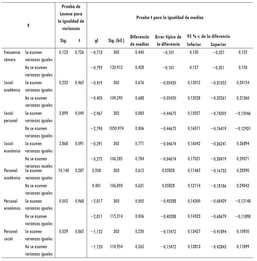 Por último, para dar respuesta a la cuarta pregunta de investigación del presente estudio e identificar diferencias entre estudiantes de género masculino y de género femenino, tanto en la decisión de mantener encendida o apagada la cámara web como en relación con las distintas variables que tienen efecto sobre la misma, se ha llevado a cabo una prueba t de Student.