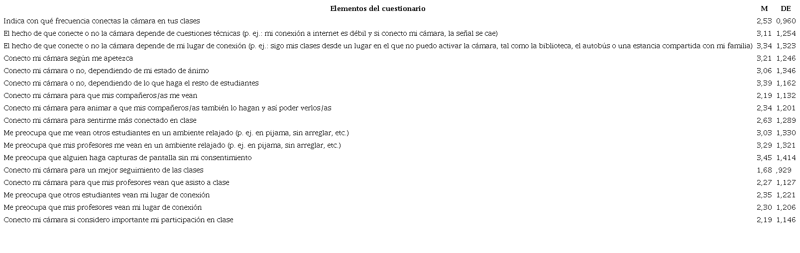 Así, como puede observarse en la Tabla 1, la puntuación media para la pregunta “indica con qué frecuencia conectas la cámara en tus clases” fue de 2,53, lo que supone, de acuerdo con la escala Likert utilizada (“nunca”, “casi nunca”, “a veces”, “casi siempre”, “siempre”), que, de forma general, el alumnado conectaba la cámara web para seguir las clases online tan solo ocasionalmente.