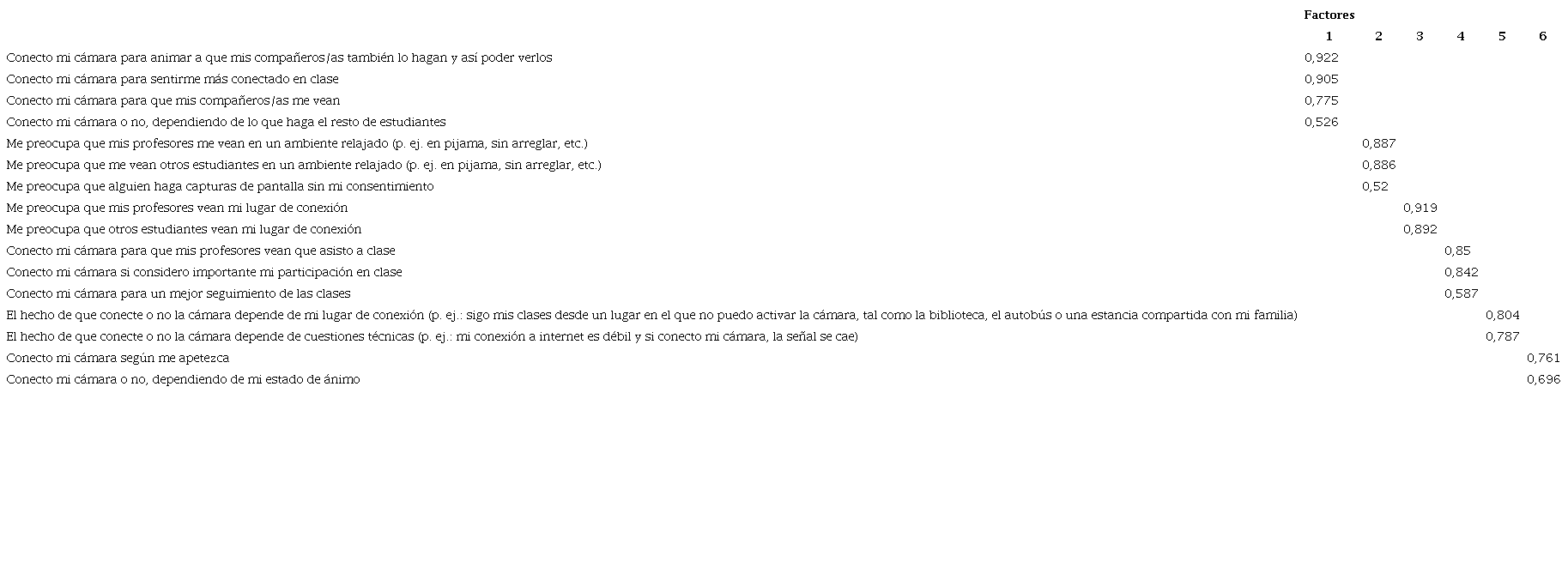 Como se observa en la Tabla 2, el análisis ha extraído 6 factores, que parecen agruparse, grosso modo, bajo razones de índole personal y social. El primer factor se encuentra conformado por los ítems del cuestionario “conecto mi cámara para animar a que mis compañeros/as también lo hagan y así poder verlos”, “conecto mi cámara para sentirme más conectado en clase”, “conecto mi cámara para que mis compañeros/as me vean” y “conecto mi cámara o no, dependiendo de lo que haga el resto de estudiantes”, lo que parece reflejar una dimensión “social-académica”, que vendría a explicar la importancia atribuida por el alumnado a la generación de presencia social en el aula, en respuesta a la separación física inherente a los entornos de aprendizaje online que da lugar a la denominada “distancia transaccional”.