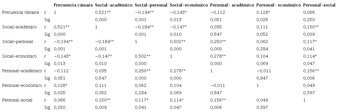 Por otra parte, en relación con la segunda pregunta de investigación, las razones aducidas por los estudiantes parecen quedar explicadas por los factores “social-académico” (importancia atribuida por el alumnado a la generación de presencia social en el aula), “social-personal” (importancia atribuida a la imagen personal proyectada ante el resto de estudiantes), “social-económico” (importancia atribuida a los recursos proyectados ante el resto de estudiantes), “personal-académico” (importancia atribuida por el alumnado al uso de la cámara sobre la calificación académica), “personal-económico” (importancia de los recursos de conexión disponibles a la hora de conectar o no la cámara) y “personal-social” (importancia atribuida a la voluntad de mostrarse ante el alumnado atendiendo a cuestiones meramente personales). De hecho, salvo esta última, todas las dimensiones mostraron correlación significativa con la frecuencia de uso de las cámaras web.